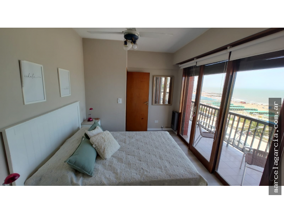 Dormitorio con cama matrimonial, con Balcon saliente frente al mar.